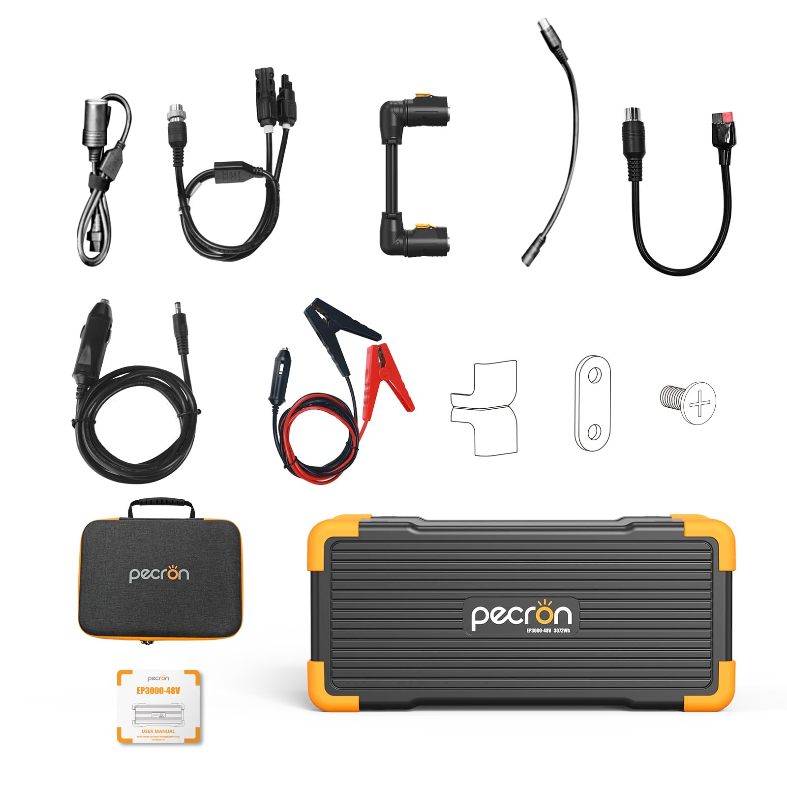 - WHAT YOU GET: pecron EP3000-48v Expansion Battery, Battery Expansion Cable, Cable from XT60 to Cigar port and 5525 port, Solar Charging Cable, Solar Cable with 5521 Connector, Anderson Solar Charging Cable, Car Charging Cable, 12V Alligator Clips, Corner protector *6, Metal connecting piece *6, Screws *6, User Manual, 12-Month Warranty, and Friendly Customer Service.