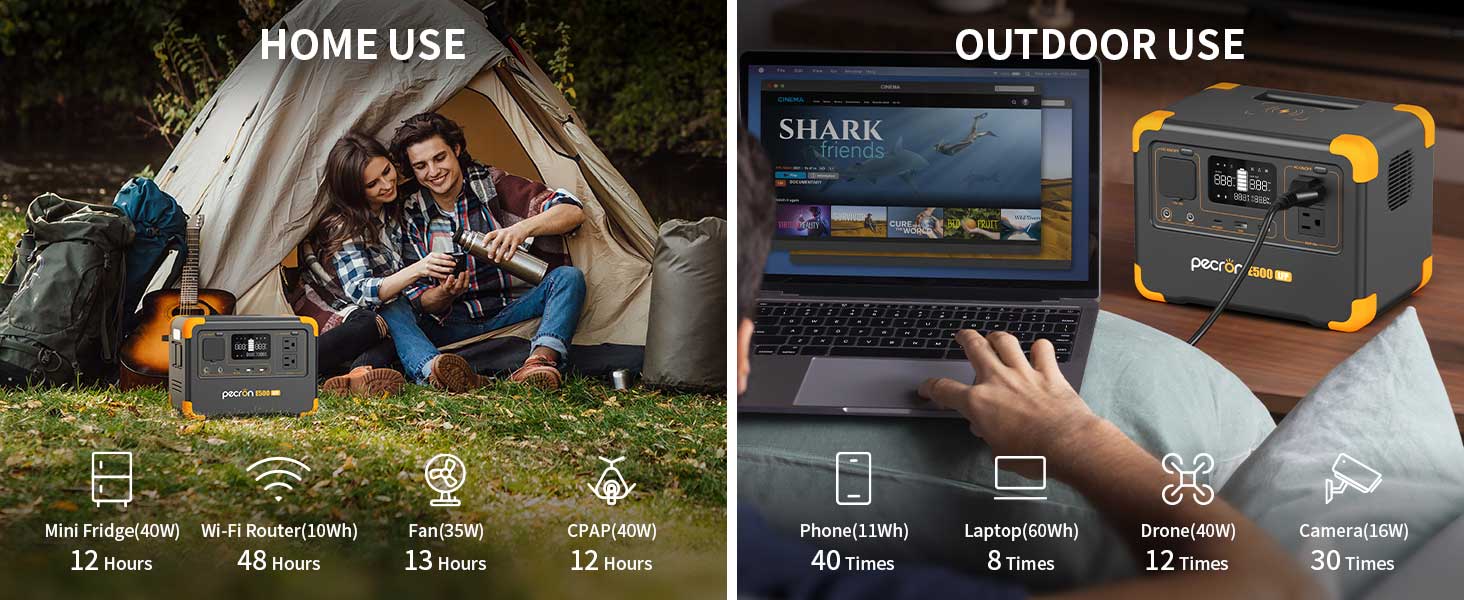 - [Charge Multiple Devices]: The E500LFP power station Equipped with 9 outputs. The E500LFP power station capacity is 576Wh and come with 600W pure sine wave, it offers sufficient power to charge various devices, making it perfect for camping trips, outdoor adventures, or emergency situations.