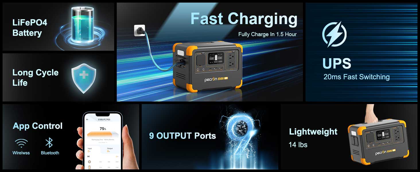 - [Fast Charging]: The E500LFP power station fully charge in 1.5 hours with 500W AC fast charging, 6 Hrs with USB-C , 100W Solar Panel and Car charging. Say goodbye to long waiting times and enjoy the convenience of rapid charging for your devices.