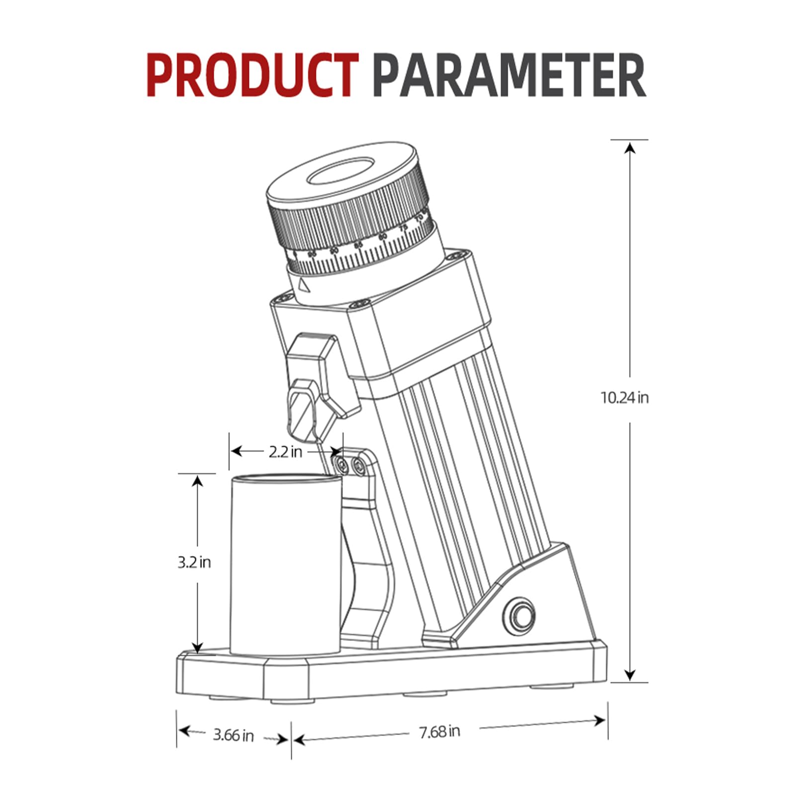• Dosing Cup :The 58mm aluminum dosing cup has a magnetic bottom and it sits on the grinding seat firmly.