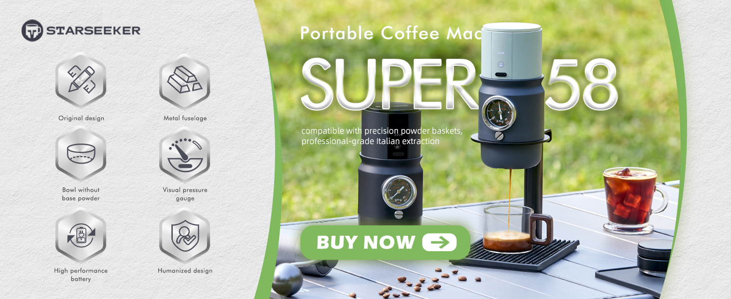 - All-metal body: Super58 espresso machine is made of aluminum alloy, fully equipped with USB-C, stand, metering funnel, coffee tamper, silicone insulation sleeve and carrying bag, convenient for carrying out