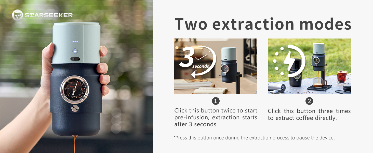 - Two brewing modes: Press and hold for 3 seconds to power on, tap twice for steeping mode for a richer flavor, or tap three times for direct extraction mode for a faster brew.